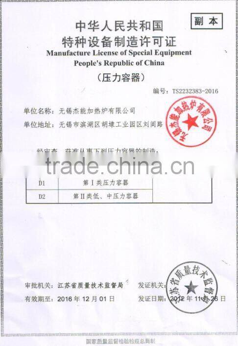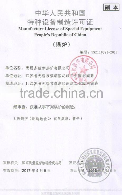 Wuxi Jineng Heating Boiler Co., Ltd., located in Hutai Industrial Park, is one of the professional manufacturers that produce various types of industrial boilers (steam boiler or hot water boiler)and organic heat carrier furnace. With advanced production and inspection equipments as well as powerful scientific research strength, our company has won the manufacture license of "B class" awarded by National Technology Inspection Bureau and got ISO9001 certificate as well.